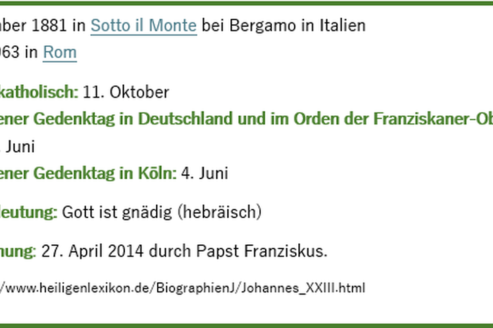 Papst Johannes XXIII., geboren 1881 als Angelo Giuseppe Roncalli in Norditalien, wuchs in bescheidenen Verhältnissen auf. Nach seiner Priesterweihe 1904 und Bischofsweihe 1925 wurde er 1958 überraschend zum Papst gewählt. Bekannt für seine Volksnähe und Bescheidenheit leitete er das Zweite Vatikanische Konzil ein, das er jedoch nicht mehr abschließen konnte, da er 1963 starb. 2000 wurde er von Papst Johannes Paul II. seliggesprochen und 2014 von Papst Franziskus heiliggesprochen.